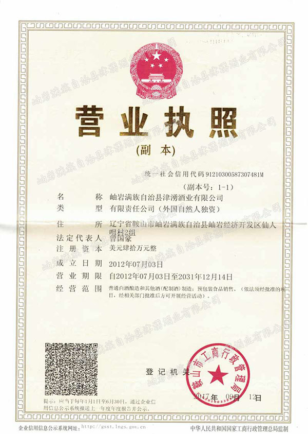 岫巖滿族自治縣津湧酒業(yè)有限公司位于風景秀麗、青山綠水的岫巖縣前營鎮(zhèn),公司占地3500平方米,年生產(chǎn)能力100噸釀造醬香原漿白酒。2013年公司產(chǎn)品“津湧豪酒”曾獲得遼寧省“遼寧放心名酒”稱號,公司現(xiàn)正研發(fā)配制酒生產(chǎn)項目,為公司發(fā)展提供技術保證。公司的注冊資本全部由美籍華人出資。